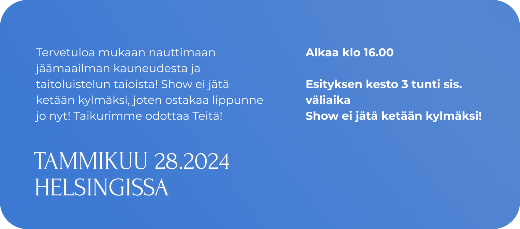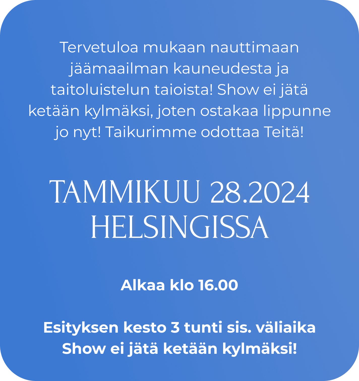 Jääsatu viulunsoittajan, kaunottaren ja fakiirin seikkailuista on henkeäsalpaava tarina koko perheelle! Sadun keskiössä olevan viuluvirtuoosin käsissä on ihmeitä tekevä ja legendaarinen Stradivarius-viulu vuodelta 1699, joka on arvoltaan useita miljoonia euroja! Satumainen tarina esitetään musiikin ja taitoluistelun keinoin. Tapahtumarikkaassa kerronnassa korostuu jään ja tulen vastakohdat, hyvän ja pahan ikuinen kamppailu.